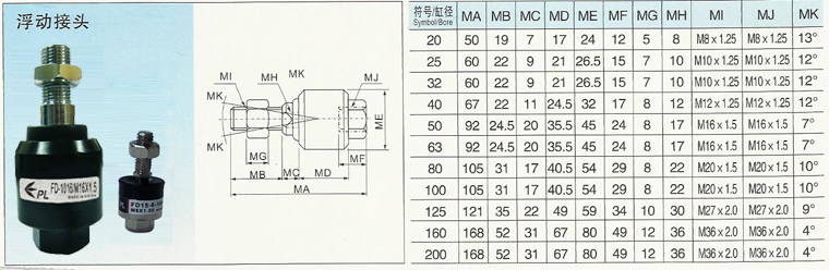 如把氣缸直徑安裝到被移動物體上,可能會因“偏心”,“平衡度精度不良”等原因,發生“活塞桿彎曲”,“桿支軸承和桿密封件磨損”等,降低氣缸的性能,縮短氣缸的使用壽命。浮動聯軸器正是未來解決偏心的問題,是氣缸動作平穩,浮動聯軸器已加潤滑油,不需要另外加油!浮動接頭吸收連接件和氣缸的偏心和平行精度不足,使氣缸和連接件在允許的偏心范圍內也可工作,它用于浮動接頭組件,使得氣缸安裝時不必對中和最后的微調整。消除兩軸間因連結誤差,所產生的干涉現象、可適度放大配合件之加工精度。符合體積小,高抗位,抗壓強度要求!